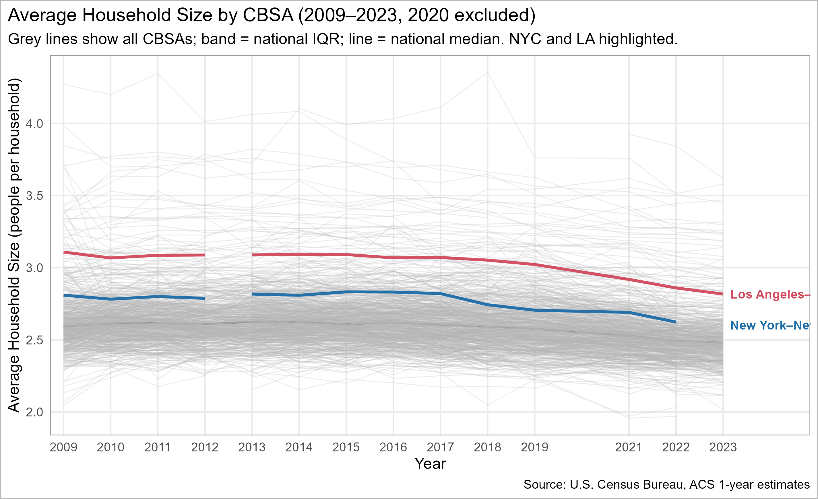 Household size over time by CBSA (2009–2023; 2020 omitted). NYC & LA highlighted; others faint for context.