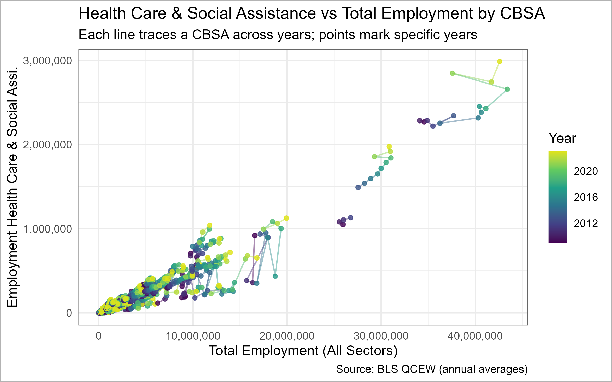 suppressPackageStartupMessages({library(dplyr); library(tidyr); library(ggplot2); library(scales)library(plotly) # install.packages("plotly") if missing})# Quick sanity: do we have data?stopifnot(exists("WAGES_CLEAN"))stopifnot(all(c("std_cbsa","YEAR","INDUSTRY","EMPLOYMENT") %in%names(WAGES_CLEAN)))# 0) Standardize CBSA key defensively to "C" + 5 digitsWAGES_std <- WAGES_CLEAN %>%mutate(std_cbsa5 =paste0("C",sprintf("%05d", suppressWarnings(as.integer(sub("^C", "", std_cbsa))))))# 1) Optional names table (robust and compatible version)cbsa_name_tbl <-if (exists("CBSA_KEYS_std")) { CBSA_KEYS_std %>% dplyr::select(std_cbsa, NAME) } elseif (exists("CBSA_KEYS_FULL")) { CBSA_KEYS_FULL %>% dplyr::transmute(std_cbsa =paste0("C", sprintf("%05d", as.integer(CBSA))), NAME ) } elseif (exists("CBSA_KEYS")) { CBSA_KEYS %>% dplyr::transmute(std_cbsa =paste0("C", sprintf("%05d", as.integer(CBSA))), NAME ) } else { INCOME %>% dplyr::distinct(GEOID, NAME) %>% dplyr::transmute(std_cbsa = GEOID, NAME) }stopifnot(all(grepl("^C\\d{5}$", cbsa_name_tbl$std_cbsa)))# 2) Build per-CBSA, per-year totalsnaics62_over_time <- WAGES_std %>%group_by(std_cbsa5, YEAR) %>%summarise(total_emp =sum(EMPLOYMENT, na.rm =TRUE),emp_62 =sum(if_else(INDUSTRY ==62L | (INDUSTRY %/%100) ==62L, EMPLOYMENT, 0L), na.rm =TRUE),.groups ="drop") %>%left_join(cbsa_name_tbl %>%rename(std_cbsa5 = std_cbsa), by ="std_cbsa5") %>%mutate(NAME =if_else(is.na(NAME), std_cbsa5, NAME)) %>%filter(total_emp >0) %>%mutate(tooltip =paste0(NAME, " (", YEAR, ")\n","Total Emp: ", comma(total_emp), "\n","NAICS 62 Emp: ", comma(emp_62)))# 3) Base ggplot (paths show evolution; points mark years)p2_base <-ggplot(naics62_over_time,aes(x = total_emp, y = emp_62, group = std_cbsa5, color = YEAR, text = tooltip)) +geom_path(alpha =0.45) +geom_point(size =1.6, alpha =0.8) +scale_x_continuous(labels =label_number(big.mark =",")) +scale_y_continuous(labels =label_number(big.mark =",")) +scale_color_viridis_c(end =0.95) +labs(title ="Health Care & Social Assistance vs Total Employment by CBSA",subtitle="Each line traces a CBSA across years; points mark specific years",x ="Total Employment (All Sectors)",y ="Employment Health Care & Social Assi.",color ="Year",caption ="Source: BLS QCEW (annual averages)") +theme_minimal(base_size =13) +theme(legend.position ="right")# 4) Static (bordered) version for PNG/exportp2_static <- p2_base +theme(panel.border =element_rect(color ="grey40", fill =NA, linewidth =0.7),plot.background =element_rect(color ="grey70", fill ="white", linewidth =0.5))# 5) Interactive version (border + modebar space)p2_interactive <-try({ggplotly(p2_base, tooltip ="text") %>%layout(margin =list(t =95, r =20, b =60, l =70),title =list(text ="Health Care & Social Assistance vs Total Employment by CBSA",font =list(size =20)),legend =list(title =list(text ="Year")),shapes =list(list(type ="rect", xref ="paper", yref ="paper",x0 =0, y0 =0, x1 =1, y1 =1,line =list(color ="grey40", width =1), fillcolor ="rgba(0,0,0,0)"))) %>%config(displayModeBar =TRUE)}, silent =TRUE)# 6) Render interactive in HTML, else static fallbackif (knitr::is_html_output() &&!inherits(p2_interactive, "try-error")) {p2_interactive} else {print(p2_static)}