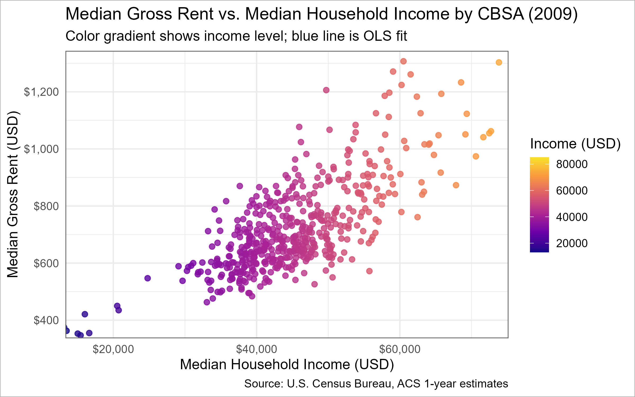 suppressPackageStartupMessages({library(dplyr); library(tidyr); library(ggplot2); library(scales); library(plotly)})# Data prep (2009 only) rent_income_2009 <- INCOME %>%filter(year ==2009) %>%select(GEOID, NAME, household_income, year) %>%left_join(RENT %>%filter(year ==2009) %>%select(GEOID, monthly_rent), by ="GEOID") %>%drop_na(household_income, monthly_rent) %>%mutate(tooltip =paste0(NAME, "\n","Income: ", dollar(household_income), "\n","Rent: ", dollar(monthly_rent)))xlims <-quantile(rent_income_2009$household_income, c(0.01, 0.99), na.rm =TRUE)ylims <-quantile(rent_income_2009$monthly_rent, c(0.01, 0.99), na.rm =TRUE)# Base ggplot (used for both static export and interactive conversion)p_base <-ggplot(rent_income_2009,aes(x = household_income, y = monthly_rent, color = household_income, text = tooltip)) +geom_point(size =2, alpha =0.8) +geom_smooth(method ="lm", se =FALSE, color ="#1b6ca8", linewidth =1) +coord_cartesian(xlim = xlims, ylim = ylims) +scale_color_viridis_c(option ="C", end =0.95) +scale_x_continuous(labels =label_dollar()) +scale_y_continuous(labels =label_dollar()) +labs(title ="Median Gross Rent vs. Median Household Income by CBSA (2009)",subtitle="Color gradient shows income level; blue line is OLS fit",x ="Median Household Income (USD)",y ="Median Gross Rent (USD)",color ="Income (USD)",caption ="Source: U.S. Census Bureau, ACS 1-year estimates") +theme_minimal(base_size =13)# Static version with ggplot borders (used for PNG)p_static <- p_base +theme(panel.border =element_rect(color ="grey40", fill =NA, linewidth =0.7),plot.background =element_rect(color ="grey70", fill ="white", linewidth =0.5),legend.position ="right")# Interactive version with Plotly shape border + spacing for modebar p_interactive <-ggplotly(p_base, tooltip ="text") %>%layout(margin =list(t =110, r =20, b =60, l =70),title =list(text ="Median Gross Rent vs. Median Household Income by CBSA (2009)",font =list(size =20)),legend =list(title =list(text ="Income (USD)")),shapes =list(list(type ="rect", xref ="paper", yref ="paper",x0 =0, y0 =0, x1 =1, y1 =1,line =list(color ="grey40", width =1), fillcolor ="rgba(0,0,0,0)"))) %>%config(displayModeBar =TRUE)# Render interactive in the document p_interactive